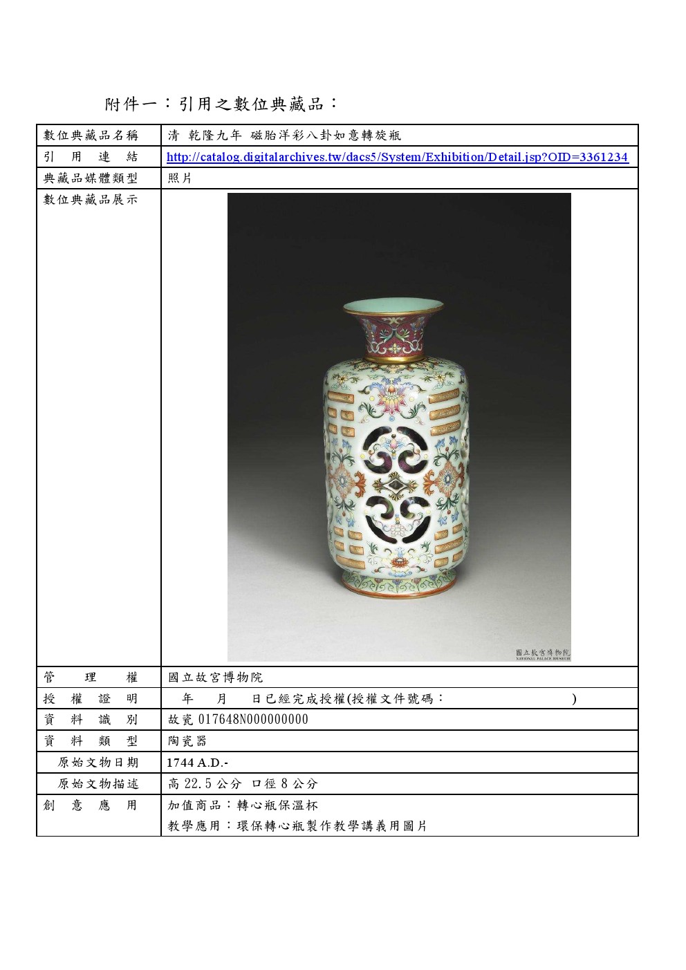 品名:故宮數典品創意推廣教案-環保轉心瓶DIY整體教案