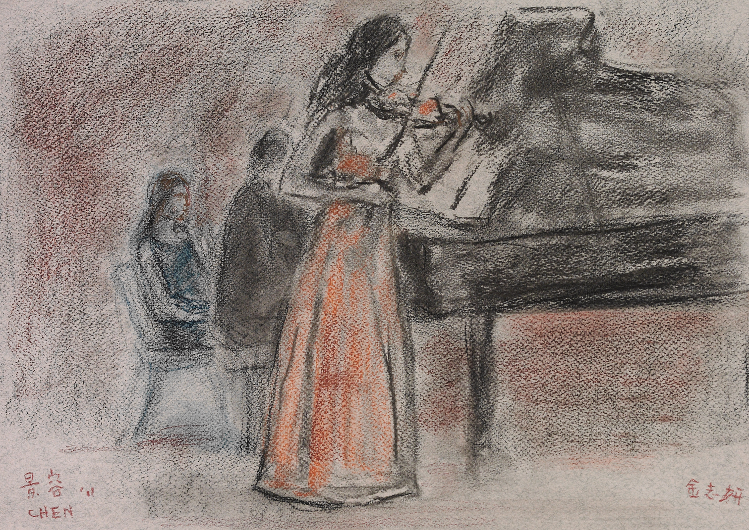 粉彩/2011年 29.5x42cm 作品描述:欣賞音樂會同時快速的畫下演奏者與樂器,捕捉動態的音樂家細膩的描繪出演奏者彈奏樂器間流暢的筆觸。